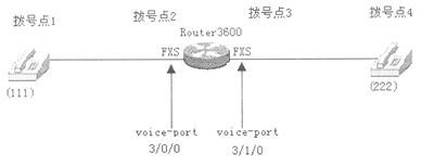 (1)在裝有兩個(gè)語(yǔ)音模塊的3600路由器上實(shí)現(xiàn)IP語(yǔ)音電話(如下圖所示)。