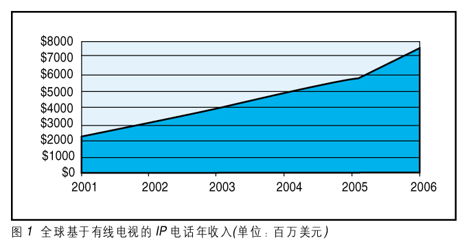 有線電視運營商在尋找使用有線電視基礎網絡HFC的新服務,創(chuàng)造新的經濟增長點,提供數據、語音、圖像綜合的服務;谟芯電視系統(tǒng)的IP電話將是第一個最有可能推出的新服務。2002年InStat/MDR的分析報告說2006年基于有線電視的IP電話網將達到US$75億的年收入,如圖1所示。