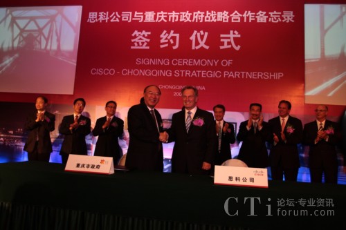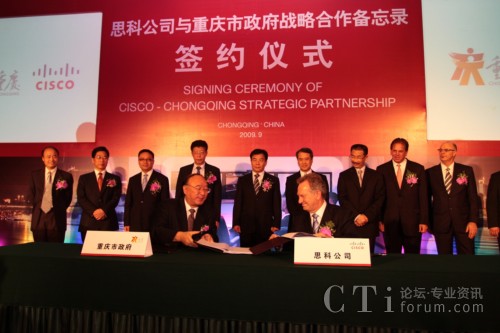 CTI論壇(ctiforum)9月14日消息:2009年9月11日,重慶市人民政府與思科正式簽訂合作備忘錄,雙方將結(jié)為戰(zhàn)略合作伙伴關(guān)系,就通信產(chǎn)品制造、“智能+互聯(lián)城市”試點(diǎn)示范、綠色技術(shù)研發(fā)與創(chuàng)新及風(fēng)險(xiǎn)投資等多方面展開深入合作。此次合作將進(jìn)一步加快重慶市產(chǎn)業(yè)結(jié)構(gòu)和產(chǎn)品結(jié)構(gòu)調(diào)整,促進(jìn)內(nèi)陸開放城市建設(shè);加快發(fā)展重慶通信產(chǎn)品產(chǎn)業(yè)集群,把重慶建設(shè)成為西部重要的現(xiàn)代通信產(chǎn)品制造基地;推動(dòng)以信息產(chǎn)業(yè)為主體的重慶高新技術(shù)產(chǎn)業(yè)發(fā)展以及本土創(chuàng)新和可持續(xù)性能力的提供,更高效便捷地加快本土企業(yè)的國際化進(jìn)程;整合多方國際資源,以推進(jìn)重慶在中國率先成為“智能+互聯(lián)城市”,讓市民享受更多的工作和生活便利及實(shí)惠。作為思科在華創(chuàng)新及可持續(xù)發(fā)展戰(zhàn)略實(shí)施的又一里程碑,此次合作不僅是思科“智能+互聯(lián)城市”計(jì)劃在中國與當(dāng)?shù)卣氖锥群献黜?xiàng)目,也是思科在“協(xié)作型創(chuàng)新模式”指導(dǎo)下激勵(lì)本土創(chuàng)新的全新實(shí)踐。