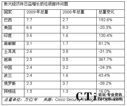 垃圾郵件:社交網(wǎng)站可能是網(wǎng)絡(luò)犯罪尋找新的受害者的地方。然而,垃圾郵件仍然是誘騙人們下載惡意軟件和慫恿他們購買諸如假藥等商品的可靠手段。《年度安全報告》估計,2010年全球范圍的垃圾郵件量與2009年的水平相比,可能會增加30-40%。然而,思科自己的SensorBase數(shù)據(jù)顯示,美國和其他經(jīng)濟發(fā)達國家(例如歐盟內(nèi)部的國家)開始在他們各自的國家關(guān)閉垃圾郵件僵尸(spam zombies),而發(fā)展中國家(包括印度和越南)已經(jīng)成為垃圾郵件日益增長的源頭。事實上,美國不再是第一大垃圾郵件發(fā)送者。2009年巴西躍居第一。