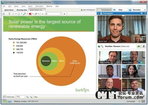 隨著支持高質(zhì)量視頻的思科WebEx™ Meeting Center的推出,與會(huì)者將能夠在全屏視頻模式下非常清晰的看到其他與會(huì)人員,從而使網(wǎng)絡(luò)會(huì)議變成一個(gè)虛擬視頻會(huì)議室。除了能夠通過高清晰度的全屏顯示看到發(fā)言者外,用戶還能同時(shí)共享桌面,并通過思科的 WebEx One Touch輕松接入思科網(wǎng)真會(huì)議。思科WebEx還提供ActivePresence功能,可沿屏幕底部以條狀顯示所有與會(huì)者。當(dāng)前的發(fā)言者以全屏顯示,并保持與參會(huì)者之間的視頻交互。借助語(yǔ)音激活轉(zhuǎn)換功能,當(dāng)另一個(gè)與會(huì)者開始發(fā)言時(shí),他將被轉(zhuǎn)為全屏顯示狀態(tài)。思科網(wǎng)真終端也支持ActivePresence功能。