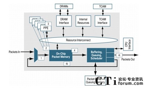 第一代QuantumFlow處理器(QFP)使用90nm工藝, QFP擁有40個定制QFP數(shù)據(jù)包處理引擎(PPE),每個PPE支持4個執(zhí)行線程。利用多達(dá)160個并行運行的獨立處理器線程,平均每線程功耗僅0.51W, 遠(yuǎn)低于業(yè)界平均水平。同時QFP提供了一個高速的多核互聯(lián)總線,確保每個內(nèi)核都能及時快速的訪問到相關(guān)的資源,并且能夠避免在不夠先進(jìn)的硬件架構(gòu)中常見的CPU過度使用和超長延遲問題,而傳統(tǒng)的網(wǎng)絡(luò)處理器架構(gòu)僅有少量的內(nèi)核,因此需要使用交換矩陣或總線將多塊網(wǎng)絡(luò)處理器互聯(lián)才能達(dá)到和QFP相同的處理速度,其功耗遠(yuǎn)高于QFP系統(tǒng),而多塊網(wǎng)絡(luò)處理器資源互相訪問將會帶來大量的數(shù)據(jù)包延遲。