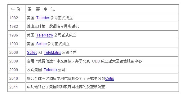 Cetis(美爵信達(dá)) 是全球酒店客房/辦公電話機的領(lǐng)導(dǎo)企業(yè),全球總部位于美國丹佛,在世界各地設(shè)有生產(chǎn)基地、銷售網(wǎng)絡(luò)及服務(wù)機構(gòu),并在全球擁有7000多家授權(quán)代理商。2009年12月18日,Cetis(美爵信達(dá))在全球 CEO 孫炳南博士的領(lǐng)導(dǎo)下,正式收購了全球最大的酒店專用電話機公司—— 美國Teledex(德利達(dá))公司,成為世界上最大、擁有全球酒店客房話機三大頂級品牌公司的龍頭企業(yè)。