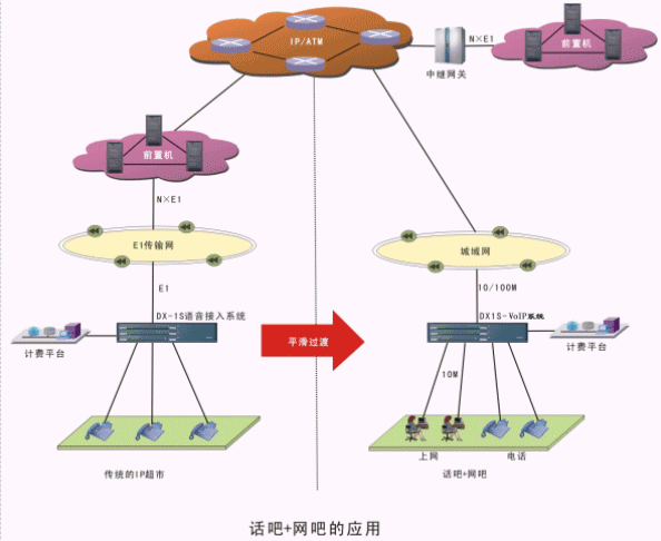 ·當前,網(wǎng)吧如雨后春筍般地在快速建立,DX1S-VoIP系統(tǒng)向下提供10M LAN口及模擬電話接口,可利用已建設好的寬帶資源,同時架設IP超市及網(wǎng)吧,資源利用率高,成本低,收效快。