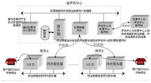 聲訊中心通過(guò)與彩票中心的聯(lián)網(wǎng)機(jī)定時(shí)地在開(kāi)獎(jiǎng)前把每期彩票投注數(shù)據(jù)傳送給彩票中心;彩票中心在開(kāi)獎(jiǎng)后把中獎(jiǎng)號(hào)碼、各等獎(jiǎng)的數(shù)目、獎(jiǎng)金金額等數(shù)據(jù)傳送到聲訊中心,聲訊中心將中獎(jiǎng)號(hào)碼和各等獎(jiǎng)金金額存入數(shù)據(jù)庫(kù)并根據(jù)中獎(jiǎng)號(hào)碼開(kāi)獎(jiǎng),生成中獎(jiǎng)記錄,通過(guò)核對(duì)中獎(jiǎng)數(shù)目后,電信營(yíng)業(yè)部門(mén)可以開(kāi)始兌獎(jiǎng)。聲訊中心每期將兌獎(jiǎng)結(jié)果傳送到彩票中心備案。