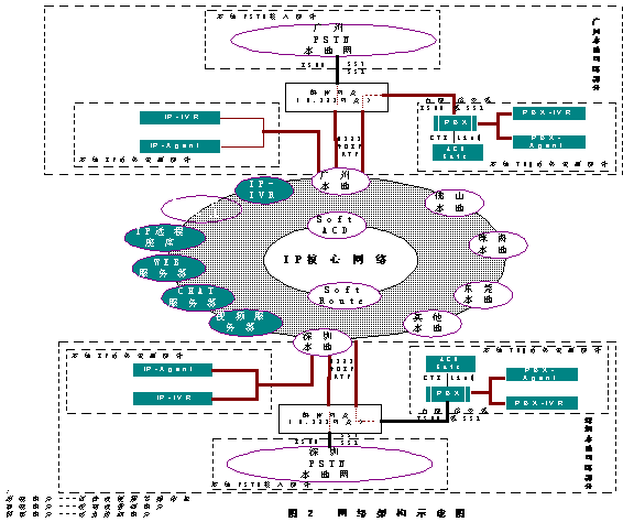 從網(wǎng)絡架構(gòu)示意圖2中可以看到,每一個PSTN本地網(wǎng)都是通過H323媒體網(wǎng)關連接到IP包交換網(wǎng)絡,再接入到呼叫中心系統(tǒng)中來的,包括廣東省內(nèi)各個比較重要的城市(如深圳,珠海,中山,東莞等等)都可以設一個H323媒體網(wǎng)關.同時所有的話務資源(如多媒體座席和IP-IVR系統(tǒng))都是直接通過IP網(wǎng)絡連接到呼叫中心系統(tǒng)中來的.