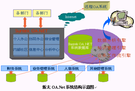 新太OA.NET系統(tǒng)采用B/S結(jié)構(gòu)設(shè)計(jì),系統(tǒng)以提供大量快速靈活的自定義功能以及許多核心平臺產(chǎn)品,如協(xié)同工作平臺、通訊平臺、知識管理平臺、信息服務(wù)平臺等,能夠幫助用戶快速實(shí)施信息化建設(shè),OA.NET系統(tǒng)的最大特色是實(shí)現(xiàn)"零代碼"維護(hù)功能,系統(tǒng)安裝后,無需編寫任何代碼就可生成各種辦公業(yè)務(wù)應(yīng)用,用戶只需幾個小時(shí)的培訓(xùn)就可以使用OA.Net提供的工具進(jìn)行復(fù)雜辦公流程的設(shè)計(jì),并且可以不需要經(jīng)過任何編碼的改動,就能輕松適應(yīng)流程變化的新情況。另外,OA.NET強(qiáng)調(diào)對企業(yè)內(nèi)部知識的有效管理和有效利用,能夠沉積企業(yè)日常的零散信息,并通過有序歸類的方式使之成為對企業(yè)有用的知識。OA.Net還提供了功能強(qiáng)大的個性化配置功能,每個員工都可以定制自己的界面風(fēng)格和功能模塊,并且可以自己建立個人的應(yīng)用環(huán)境,滿足個人的喜好。OA.Net包含了新太自主開發(fā)的業(yè)務(wù)工作流處理引擎,能夠在不用編寫代碼的情況集成其他業(yè)務(wù)系統(tǒng),實(shí)現(xiàn)了業(yè)務(wù)系統(tǒng)中的數(shù)據(jù)和辦公流程的完美結(jié)合,使得辦公應(yīng)用系統(tǒng)真正成為企業(yè)內(nèi)部的廣義化辦公門戶。