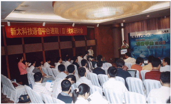 7月23日,新太科技在廣州花園酒店舉行"語(yǔ)音平臺(tái)速能II技術(shù)研討會(huì)"。新太科技執(zhí)行總裁梁平、副總裁何健明,開(kāi)發(fā)中心副經(jīng)理張少文,營(yíng)銷中心國(guó)際業(yè)務(wù)部副總經(jīng)理馬任遠(yuǎn)、產(chǎn)品經(jīng)理黃偉,新太科技合作伙伴Intel公司通訊產(chǎn)品業(yè)務(wù)部戰(zhàn)略客戶經(jīng)理林競(jìng)宇,新太語(yǔ)音平臺(tái)速能產(chǎn)品核心代理商--廣州納特威科技公司總經(jīng)理黃淡輝,渠道總代理商--深圳意科特實(shí)業(yè)有限公司總經(jīng)理李面換等到會(huì)并作主題發(fā)言!吨袊(guó)計(jì)算機(jī)報(bào)》、《計(jì)算機(jī)世界》、《SP計(jì)算機(jī)產(chǎn)品與流通》、IT168共四家專業(yè)媒體記者到會(huì)采訪。