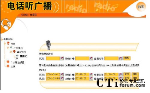 定制自動聽廣播的目的是:用戶設(shè)定的時(shí)間到達(dá)時(shí),由系統(tǒng)主動呼叫用戶所定制的電話,用戶摘機(jī)即可收聽到所定制的廣播節(jié)目內(nèi)容。用戶要獲取該自動服務(wù)的前提是,必須預(yù)先定制好外呼時(shí)間、外呼電話和廣播內(nèi)容。