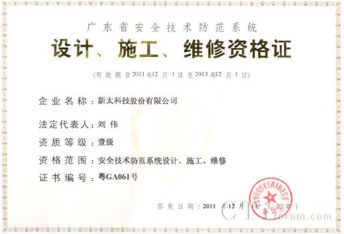 CTI論壇(ctiforum)12月21日消息(記者 張潔):2011年12月,新太科技再傳喜訊,公司順利通過(guò)廣東省公安廳認(rèn)定的“廣東省安全技術(shù)防范系統(tǒng)設(shè)計(jì)、施工、維修一級(jí)資格證”換證審核,成功獲得新證書(shū)。