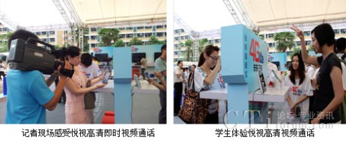 這次在廣州大學城開展的發(fā)布會,吸引了很多在校大學生的參加,下圖是記者和學生現(xiàn)場體驗通過悅視高清視頻通話玩即時猜拳游戲,傳輸?shù)乃挟嬅娣浅G逦鲿,悅視產(chǎn)品的優(yōu)質體驗讓人享受無線高質量流媒體服務的同時深刻感受到TD-LTE高帶寬、低時延的優(yōu)勢。