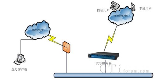 欣方洗號系統(tǒng)的服務(wù)器是一臺(tái)獨(dú)立的1U的Linux服務(wù)器,洗號軟件(SoftACD/CTI/MS等)全部安裝在該服務(wù)器里面,同時(shí)該服務(wù)器里面還安裝了E1接口卡。接口卡通過數(shù)字中繼E1連接到電信網(wǎng)(PSTN/PLMN)。系統(tǒng)呼叫的被叫用戶包括固話(小靈通)用戶、移動(dòng)(手機(jī))用戶。