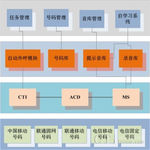 這個(gè)層次主要包括ACD、CTI和MS三個(gè)模塊。其中:   負(fù)責(zé)信令處理。即通過分析交換機(jī)發(fā)過來的掛機(jī)信令,保存被叫用戶號碼狀態(tài)。    用于指示ACD外呼被叫號碼,以及上報(bào)外呼結(jié)果到上一層。    進(jìn)行具體的錄音,以及Tone音識別、提示音識別等。