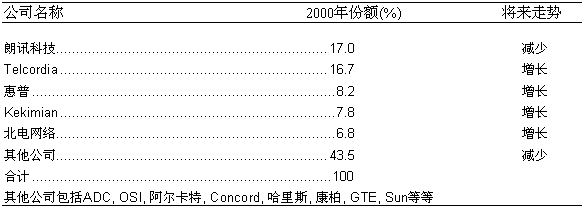 從目前市場(chǎng)情況來(lái)看,美國(guó)的固定網(wǎng)OSS服務(wù)保障的市場(chǎng)集中度相當(dāng)高。在市場(chǎng)中領(lǐng)先的公司一共有5家,它們分別是朗訊科技、Telcordia科技、惠普公司、Hekimian和北電網(wǎng)絡(luò)。這五家公司均是較早進(jìn)入這一市場(chǎng)的老牌公司。2000年,它們?cè)诠潭ňW(wǎng)OSS服務(wù)保障領(lǐng)域的銷(xiāo)售額總和為8.60億美元,約占整個(gè)市場(chǎng)的56.5%左右,另外43.5%的市場(chǎng)被約其他二十多家廠商分割。