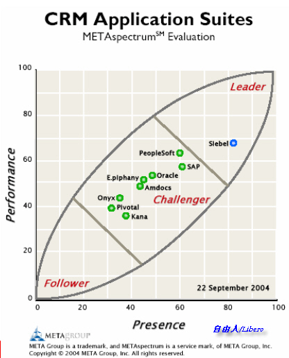 從圖表可看到,在當(dāng)時Siebel是CRM市場的領(lǐng)先者,mySAP CRM、Oracle CRM、PeopleSoft CRM都是第二集團(tuán)的競爭者。