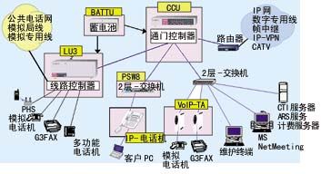 圖1顯示了一個(gè)IPstage系統(tǒng)的基本結(jié)構(gòu),IP PBX系統(tǒng)包含了通信控制器(CCU)、線路控制器(LU32)、以太網(wǎng)電話IP-TEL、連接普通電話的VoIP-TA適配器、后備電池,以及可直接連接PHS基站系統(tǒng)。通信控制器是IP PBX的核心部分,它可以配置電話的分機(jī)號(hào)碼、功能按鈕以及通話管理和路由策略;線路控制器用來實(shí)現(xiàn)IP網(wǎng)絡(luò)和傳統(tǒng)電路交換電話網(wǎng)的通信,完成異種網(wǎng)絡(luò)的電話呼入和呼出,;VoIP-TA適配器用來為傳統(tǒng)的模擬電話和傳真機(jī)服務(wù),PHS基站系統(tǒng)可實(shí)現(xiàn)無線市話功能。在網(wǎng)絡(luò)中的H.323客戶端(如NetMeeting用戶)同樣可以和其它電話進(jìn)行通話。