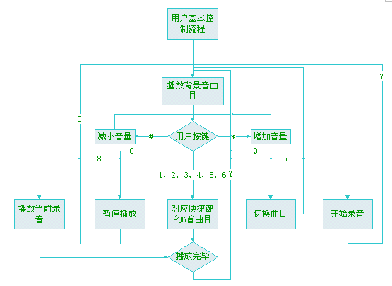 用戶設(shè)定:用戶可以通過語音自動(dòng)導(dǎo)航或者通過上網(wǎng)來自主選擇并設(shè)定背景音效,并把其中最常用的六種音效對應(yīng)1~6號按鍵,這樣用戶在自己使用的過程中就可以根據(jù)當(dāng)時(shí)的情況使用自己喜歡的背景音效了。