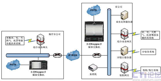 東進固網(wǎng)支付平臺通過IP專網(wǎng)將省公司和各地市公司的系統(tǒng)連接起來,采取二級地市分公司數(shù)據(jù)接入、運營商總部集中處理的拓撲架構,實現(xiàn)業(yè)務的全省統(tǒng)一運營。各地市公司分別建設一套接入平臺,業(yè)務處理服務器統(tǒng)一建設在運營商總部。各地市的水、電、煤氣、電信、彩票等外部系統(tǒng)通過在本地建設的綜合業(yè)務網(wǎng)關與業(yè)務系統(tǒng)對接,支付業(yè)務統(tǒng)一通過運營商總部所在地銀聯(lián)轉到各地銀聯(lián)進行。
