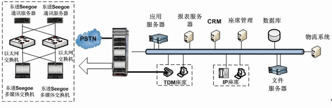東進技術電視購物呼叫中心解決方案,采用東進技術Seegoe系列多媒體交換機和多媒體服務器搭建系統(tǒng)平臺。東進Seegoe系列多媒體交換機,具有豐富的媒體資源和強大的處理能力,并提供功能模塊的N+1全冗余備份,滿足了高負荷、大并發(fā)和關鍵業(yè)務的可靠運營。以Seegoe多媒體交換機、Seegoe通訊服務器為核心的面向業(yè)務流程的呼叫中心平臺在媒體交換層以全新的IP架構實現(xiàn)網絡融合、應用融合和業(yè)務融合。如下圖所示: