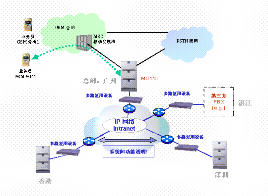 同時(shí),在公司總部, 用愛(ài)立信MD110替換原有交換機(jī),并與廣東移動(dòng)直接相連,總部配180個(gè)設(shè)定不同的權(quán)限級(jí)別的ME(移動(dòng)分機(jī)),使經(jīng)常在外辦理業(yè)務(wù)的人員的手機(jī)號(hào)被注冊(cè)為總部交換機(jī)的一個(gè)移動(dòng)分機(jī)。廣東移動(dòng)為所有移動(dòng)分機(jī)提供特殊價(jià)格。