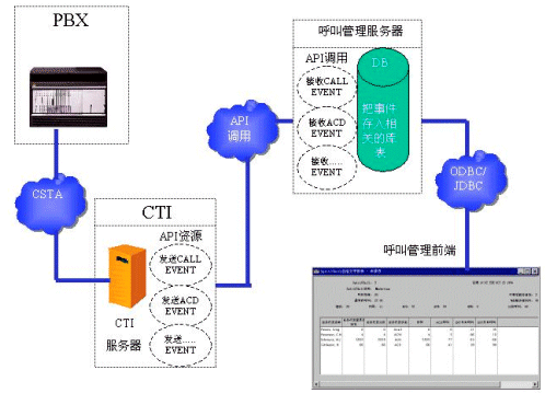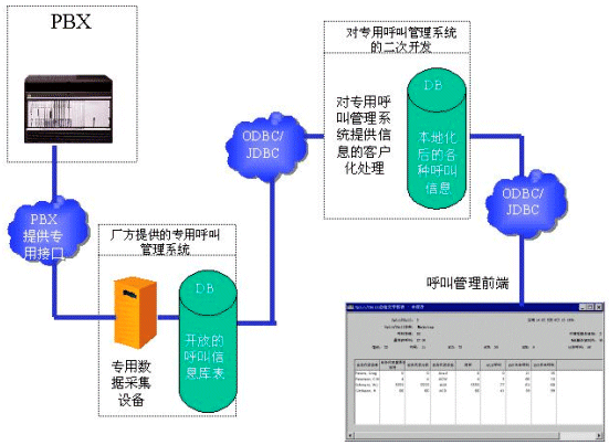 一般來說,各大有能力推出PBX產(chǎn)品的通訊廠商都有自己專用的呼叫管理系統(tǒng)。這些專用的呼叫管理系統(tǒng)可以直接從PBX獲取最高效的消息,而不用通過CTI SERVER。當(dāng)然,這些專用的呼叫管理系統(tǒng)也只能應(yīng)用于專門的PBX產(chǎn)品。 如果運營商在選購設(shè)備的時候,已經(jīng)選購了專用的呼叫管理系統(tǒng),那么開發(fā)商可以對這個專門的呼叫管理系統(tǒng)進行二次開發(fā)。請看下面的數(shù)據(jù)流程圖: