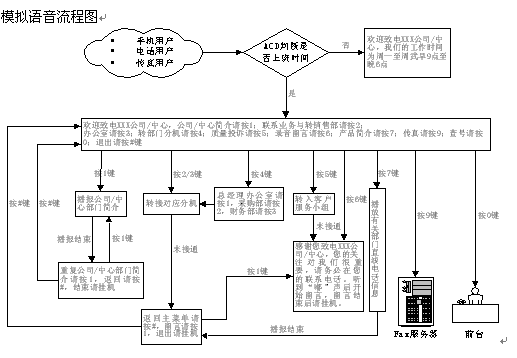 - 本系統(tǒng)的服務(wù)內(nèi)容包括:企業(yè)與政府部門(mén)簡(jiǎn)介,產(chǎn)品與服務(wù)簡(jiǎn)介,人工服務(wù),轉(zhuǎn)部門(mén)分機(jī),呼叫轉(zhuǎn)移,部門(mén)直線電話(huà)號(hào)碼查詢(xún),質(zhì)量與服務(wù)投訴,錄音留言等。
