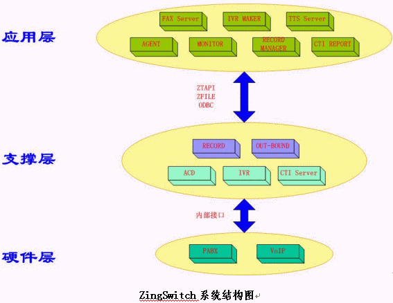 在以上三層結構中,前兩層與具體業(yè)務系統(tǒng)無關。上層業(yè)務系統(tǒng)的多種變化,不會影響下層的穩(wěn)定;而下層規(guī)范地進行優(yōu)化和擴展后,上層的所有應用都可在業(yè)務功能上得到擴展。這樣,用戶的業(yè)務應用系統(tǒng)自身可以有多種功能和性能的變動和擴展,同時,當基于ZingSwitch一體化交換機的呼叫中心系統(tǒng)平臺在進行擴容、升級的時候,原來已經無縫掛接其上的用戶的業(yè)務應用系統(tǒng)也無需任何更改即可運行。