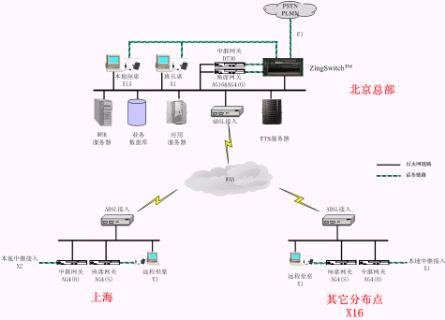 系統(tǒng)在北京總部部署了一套英立訊的ZingSwitch一體化交換機,采用高度集成的ALL-IN-ONE方式提供了PABX、ACD、CTI Server、IVR Server、實時錄音等功能,同時配置了FAX/TTS服務(wù)器,用于提供與呼叫平臺集成的傳真/文本轉(zhuǎn)語音等功能。系統(tǒng)只在北京總部安裝了一套一體化呼叫中心,其他各分布點只設(shè)立坐席和中繼。這樣既能保證業(yè)務(wù)的正常運行還為企業(yè)大大的降低成本。英立訊科技為正普科技提供的基于VoIP分布式呼叫中心解決方案在業(yè)內(nèi)也是一個新的典范,對于分支機構(gòu)多而每個分支機構(gòu)座席少量的情況提出了這種極具實用性和擴展性的解決方案,真正從用戶角度出發(fā),為用戶量身打造全業(yè)務(wù)、高性價比的呼叫中心。