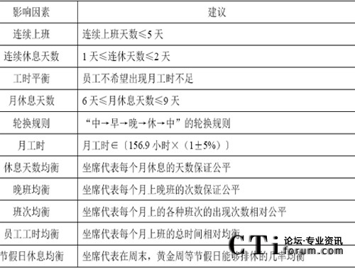 要滿足每半小時(shí)實(shí)際安排的座席數(shù)量不少于需要的座席數(shù)量的要求,首先就需要進(jìn)行班次的設(shè)計(jì),這是為第五環(huán)節(jié)資源規(guī)劃而準(zhǔn)備的。“班次設(shè)計(jì)”是指設(shè)計(jì)出一系列的班次,比如早班,中班,晚班,等等。而將來(lái)只要告訴員工,你下個(gè)月每天各上什么樣的班次即可。在班次設(shè)計(jì)時(shí),需要充分考慮前面提到的一些影響因素:如下所示。