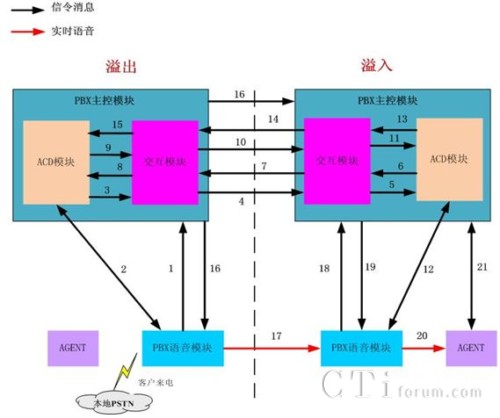 通過(guò)PBX/ACD建立一種電話路由共享和語(yǔ)音溢出的方法,實(shí)現(xiàn)多套聯(lián)絡(luò)中心平臺(tái)之間語(yǔ)音的動(dòng)態(tài)互溢,透明地為客戶提供優(yōu)質(zhì)、及時(shí)的電話服務(wù),客戶感覺不到任何差異。通過(guò)PBX/ACD建立一種電話路由共享和語(yǔ)音溢出的方法,作為行業(yè)現(xiàn)有實(shí)現(xiàn)方法的有效補(bǔ)充,解決了行業(yè)現(xiàn)有實(shí)現(xiàn)方法的無(wú)法實(shí)現(xiàn)最短路徑溢出問(wèn)題,通過(guò)ACD的“先排隊(duì)后進(jìn)門”的預(yù)約預(yù)定模式,動(dòng)態(tài)判斷彼此的運(yùn)行狀態(tài)和處理能力,無(wú)需先將語(yǔ)音溢出到另外一個(gè)聯(lián)絡(luò)中心,只有當(dāng)另外一個(gè)聯(lián)絡(luò)中心確定能提供相應(yīng)的語(yǔ)音服務(wù)和人工服務(wù)的時(shí)候,語(yǔ)音才在PBX語(yǔ)音層面通過(guò)標(biāo)準(zhǔn)通信協(xié)議進(jìn)行互聯(lián)互通,避免實(shí)時(shí)語(yǔ)音被多次溢出,實(shí)時(shí)實(shí)時(shí)語(yǔ)音溢出只走最短路徑,保證客戶電話只需一次溢出就能立即提供語(yǔ)音服務(wù)和人工服務(wù),大幅減少了語(yǔ)音溢出的處理時(shí)間,同時(shí)也大幅減少了語(yǔ)音處理次數(shù),提升了系統(tǒng)處理性能。