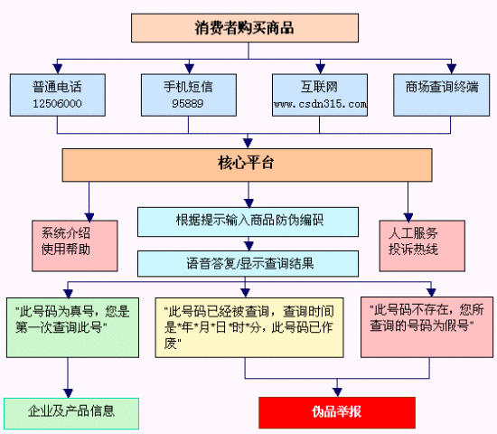 通過登錄www.csdn315.com,進行商品真?zhèn)蔚牟樵,同時可以等到商品許多有用的相關(guān)信息。通過網(wǎng)站還將獲取防偽的相關(guān)資訊、購物指導(dǎo)性建議、國家有關(guān)的防偽法律知識;
