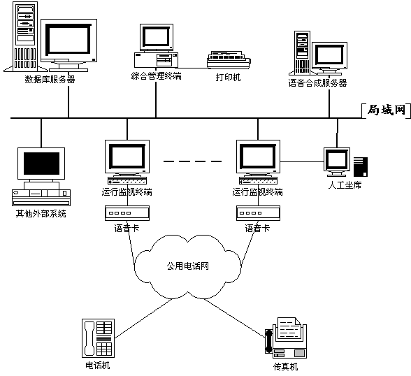 管理終端通道設置、業(yè)務內容設置、操作人員管理,打印各種報表、報警數(shù)據(jù)。上面安裝綜合管理子系統(tǒng),操作系統(tǒng)為Windows 95/98/2000。