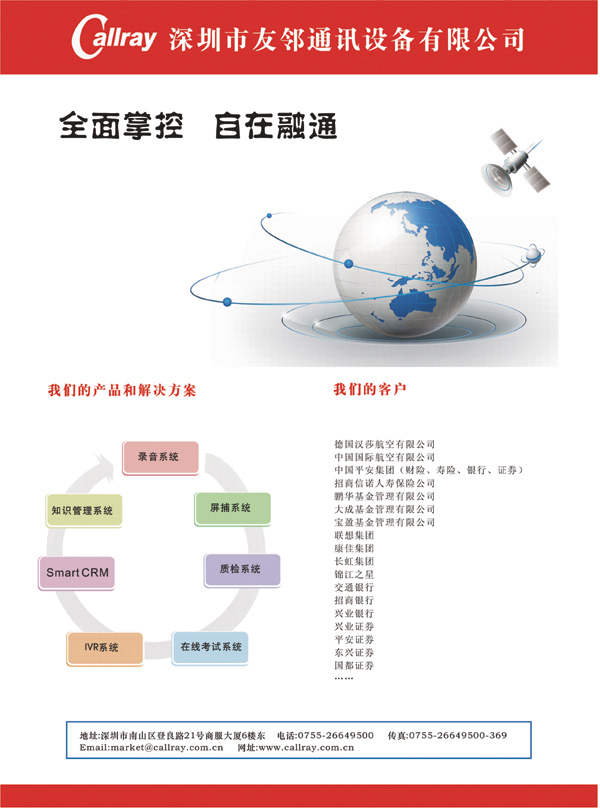 深圳市友鄰?fù)ㄓ嵲O(shè)備有限公司作為國(guó)內(nèi)最早的呼叫中心質(zhì)量管理軟件開(kāi)發(fā)商之一,在專(zhuān)業(yè)技術(shù)、現(xiàn)場(chǎng)開(kāi)發(fā)和工程實(shí)施等方面均積累了豐富的經(jīng)驗(yàn)。友鄰公司將承諾對(duì)這一新興行業(yè)的責(zé)任,即立足于自主開(kāi)發(fā)并結(jié)合中國(guó)國(guó)情,并始終堅(jiān)持走呼叫中心質(zhì)量管理軟件這一方向,是相關(guān)行業(yè)用戶(hù)和業(yè)務(wù)應(yīng)用軟件開(kāi)發(fā)商的首選之一。