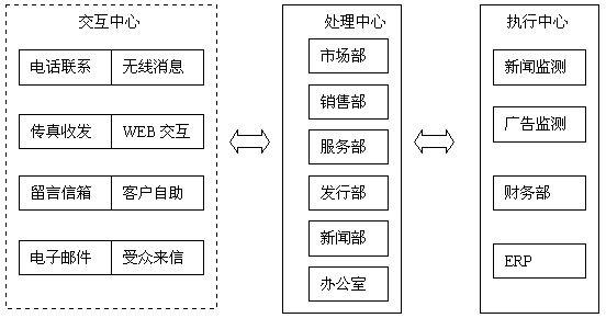 協(xié)同CRM結(jié)合呼叫中心與客戶(hù)廣泛交互,對(duì)信息進(jìn)行全面綜合處理。系統(tǒng)可以分為交互中心、處理中心、執(zhí)行中心三部分。
