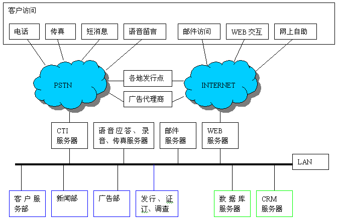 硬件方面,采用價(jià)格經(jīng)濟(jì)、功能靈活的基于語(yǔ)音板卡的呼叫中心平臺(tái)。在軟件方面,采用高可靠性的實(shí)時(shí)LINUX操作系統(tǒng)。具有高效、穩(wěn)定、安全以及功能齊全等特點(diǎn)。坐席端軟件實(shí)現(xiàn)了強(qiáng)大電話(huà)處理功能,支持實(shí)時(shí)錄音、兼聽(tīng)、強(qiáng)插、強(qiáng)拆等應(yīng)用;跒g覽器的瘦客戶(hù)端與CRM的客戶(hù)界面完美融合。并且提供詳盡的報(bào)表功能。支持智能化路由、多種排隊(duì)策略的選擇,實(shí)現(xiàn)與CRM無(wú)縫結(jié)合。