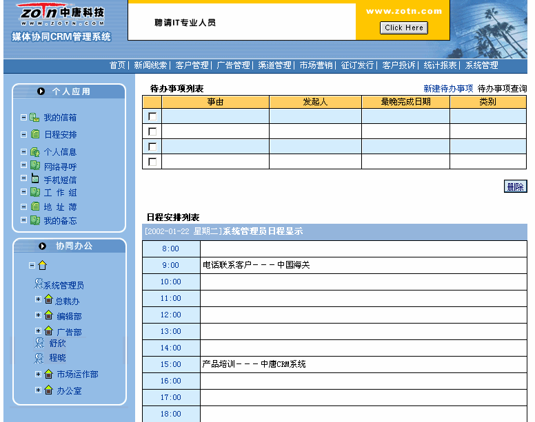 協(xié)同CRM實(shí)現(xiàn)單位內(nèi)部各個(gè)部門(mén)、各地分支機(jī)構(gòu)、代理商以客戶(hù)為中心協(xié)同工作,具體功能包括對(duì)新聞線(xiàn)索的管理,對(duì)廣告的管理,對(duì)征訂發(fā)行的管理,客戶(hù)反饋的管理,客戶(hù)信息分析決策,競(jìng)爭(zhēng)對(duì)手管理、檢索統(tǒng)計(jì)輸出、系統(tǒng)維護(hù)等模塊。