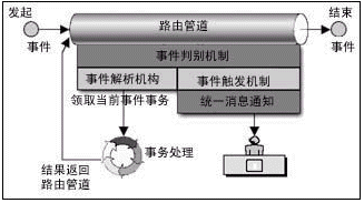 在路由管道中流轉(zhuǎn)著加載了業(yè)務(wù)的工作流事件。事件按照事先定義的路由規(guī)則流轉(zhuǎn),事件的路由規(guī)則定義了事件在路由管道中可以停靠的“站臺”,同時定義了事件到達“站臺”時可以領(lǐng)取并處理加載在事件上的業(yè)務(wù)的角色。事件從始發(fā)站臺進入路由管道,經(jīng)過一個或多個中間站臺,最后到達終點站。事件每?恳粋站臺,相關(guān)人員領(lǐng)取事務(wù),并進行處理后重新裝載事務(wù),觸發(fā)事件向下一個站臺流轉(zhuǎn),除非事件已經(jīng)到達終點站。