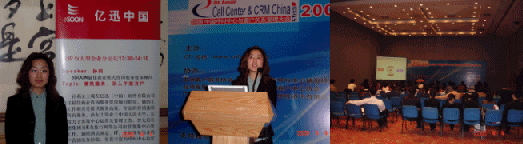 一年一度的中國呼叫中心與客戶關(guān)系管理大會(huì)于2006年4月3日在北京國際會(huì)議中心隆重開幕,并與4月5日圓滿閉幕。今年大會(huì)主題為:新時(shí)期的呼叫中心及CRM,成就與挑戰(zhàn)。此次活動(dòng)吸引了與呼叫中心相關(guān)的各界人士的光臨,共計(jì)1000多人與會(huì),活動(dòng)連續(xù)三天。億迅(中國)軟件有限公司(eSOON)作為呼叫中心及CRM業(yè)優(yōu)秀的開發(fā)商和集成商,在本次大會(huì)上以特別贊助商的身份閃亮登場,給大家留下了深刻的印象,并為大家?guī)砗艚兄行募癈RM領(lǐng)域最新的趨勢分析及最佳的解決方案。