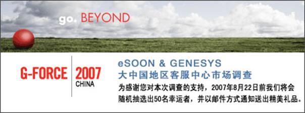 “eSOON & GENESYS 大中國地區(qū)客服中心市場調(diào)查”誠意邀請您不吝賜教,花幾分鐘時間提供您的寶貴意見并填寫。為感謝您對eSOON & GENESYS的支持,2007年8月22日前我們將會隨機抽選出50名幸運者, 并以郵件方式通知送出精美禮品。