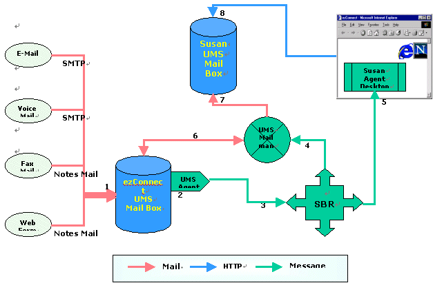 各類外部語(yǔ)音、郵件、WEB、傳真等信息進(jìn)入呼叫中心會(huì)以相應(yīng)的格式直接被放入ezConnect統(tǒng)一郵件服務(wù)器(1),消息經(jīng)過UMS Agent 模塊被提取出信息主題和關(guān)鍵字(2),這些主題和關(guān)鍵字被送入基于技能的路由選擇模塊SBR(3),由SBR進(jìn)行分析,選擇出最合適服務(wù)的座席(例如是Susan);之后SBR通知郵件轉(zhuǎn)發(fā)器(4)去ezConnect統(tǒng)一郵件服務(wù)器中取相應(yīng)的郵件(6),將郵件放入最佳座席(Susan)的UMS信箱中(7)(8),與此同時(shí)座席Susan的界面上顯示出她有一封新的郵件(5)。至此,完成了座席Susan 接收UMS信件的全過程。