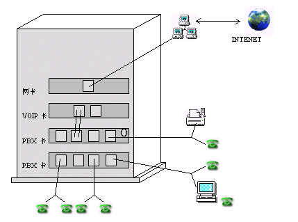 圖中假設(shè)客戶安裝了兩塊PBX板卡和一塊VOIP板卡,產(chǎn)品的板卡都插在計(jì)算機(jī)主板上的插槽上。系統(tǒng)的布線如圖所示,PBX板卡上有外線端口和分機(jī)端口(ISA型號(hào)的每個(gè)插口接4條線、PCI型號(hào)的每個(gè)插口接2條線),外線接在外線端口上,分機(jī)線接在分機(jī)端口上。VOIP板卡有2個(gè)插口,每個(gè)插口接2條線。用戶如果要使用VOIP功能,需要從分機(jī)端口接出線到VOIP端口中。客戶使用網(wǎng)絡(luò)電話時(shí),只要呼叫連接VOIP端口的分機(jī)號(hào)碼即可撥通網(wǎng)絡(luò)電話。