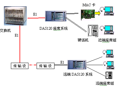 見下圖:DAS120主機通過4個E1接口與交換機直接連接,可方便地實現(xiàn)本地座席接入。遠端分布式接入則需要通過傳輸設(shè)備,它們可為光纖,微波,HDSL等。終端可為座席卡和電話機。