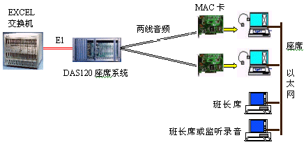 DAS120與億景座席卡MAC配合使用,可使系統(tǒng)的優(yōu)越性發(fā)揮到最大。MAC卡提供的強大功能(收發(fā)DTMF和450HZ信號音,語音錄放等)有效地簡化系統(tǒng)軟件的設(shè)計,并可降低系統(tǒng)成本,如EXCEL交換機可不用配置DSP卡,IVR可簡化等。還可以有效地降低交換機的處理負荷,提高話務(wù)處理能力。
