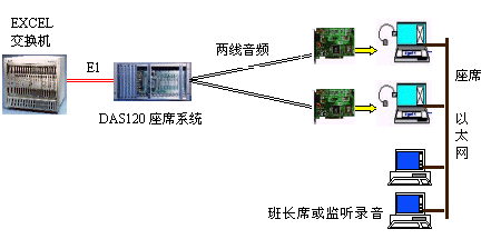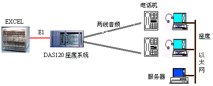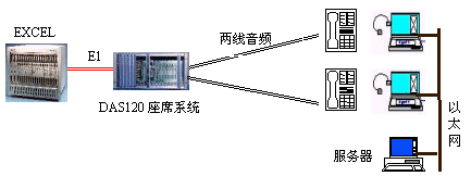 因為EXCEL交換機不能提供模擬接口。DAS120的出現(xiàn)很好地彌補了其不足。它與EXCEL交換機采用4個E1連接,可以簡潔實現(xiàn)PCM信號轉(zhuǎn)模擬信號引出到座席。E1接口的信令可選配為隨路信令CAS和透明通道Clear