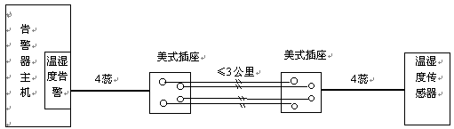 溫、濕度傳感器通過四蕊電話線與告警器主機(jī)相連。兩者距離很近時(shí),將傳感器接線插入主機(jī)溫、濕度告警接口即可。若距離不夠長時(shí),可按上圖一對(duì)一的加長連線,連線距離可達(dá)3公里。