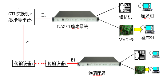 見下圖:DAS30通過1個E1接口與交換機/板卡直接連接,無需配置數(shù)據(jù),可方便地實現(xiàn)本地座席接入或遠(yuǎn)端分布式接入(需配合傳輸設(shè)備)。終端可為普通電話機或MAC座席電話卡。