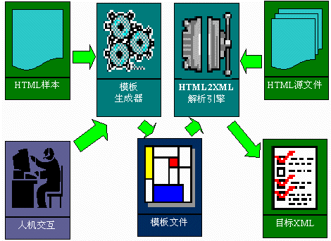 HTML2XML1.0中包括了兩個工具:HTML2XML模板生成器和HTML2XML解析引擎。通過該HTML2XML模板生成器的GUI界面和HTML2XML解析引擎,將HTML文件中的<Table>標記中的數(shù)據(jù),根據(jù)指導性文件,轉(zhuǎn)換成XML格式數(shù)據(jù),供其他應(yīng)用程序進行進一步處理。