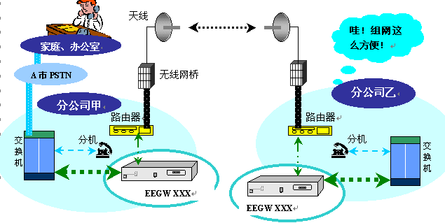 現(xiàn)今的計(jì)算機(jī)網(wǎng)絡(luò)建設(shè)中,多以DDN為主的局域網(wǎng)互連,往往由于DDN線路不能到達(dá)或要求專用內(nèi)部通道等原因,建設(shè)以無(wú)線為室外主要網(wǎng)絡(luò)通道的數(shù)據(jù)通信平臺(tái),配合IP語(yǔ)音網(wǎng)關(guān)形成內(nèi)部的語(yǔ)音通信系統(tǒng),不僅建設(shè)簡(jiǎn)單(無(wú)須各種市政管理部門(mén)的批復(fù)),并且造價(jià)較低,快速有效地解決數(shù)據(jù)互連及建立專用安全保密的內(nèi)部語(yǔ)音系統(tǒng)。
