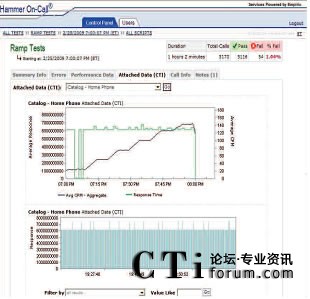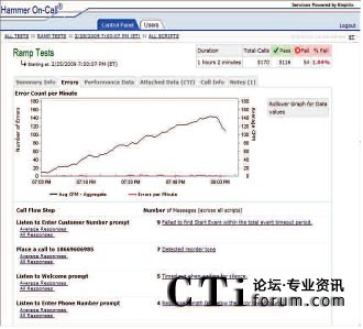Hammer On-Call IVR測試使用各種各樣的主叫場景模擬真實(shí)世界用戶交互。通過改變呼叫量和呼叫場景的混合,Empirix測試專家可以生成指向IVR的模擬真實(shí)世界的呼叫流量。此外,在測試中,不同的呼叫測試點(diǎn)上可以使用不同的呼叫率。在測試過程中經(jīng)常會(huì)用到三種基本呼叫模型及其變體;緶y試是使用一個(gè)恒定的低呼叫率檢驗(yàn)被測環(huán)境是否已準(zhǔn)備好接受呼叫;增量測試是使用一個(gè)固定增量穩(wěn)步增加呼叫量一直到達(dá)峰值呼叫量,然后,增加呼叫量直至超過期望值,檢驗(yàn)系統(tǒng)在峰值時(shí)段內(nèi)是否有額外容量;最后,‘浸透’測試是在指定的時(shí)段內(nèi)使用一個(gè)恒定的高呼叫率檢驗(yàn)系統(tǒng)穩(wěn)定性。