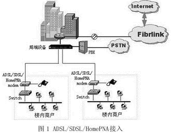 中電飛華在光纖(或其他專線)接入的基礎上提供樓宇、小區(qū)的整體接入解決方案,即在光纖接入到樓宇和小區(qū)之后,通過各種接入手段將樓內(nèi)商業(yè)用戶、小區(qū)個人用戶等接入Internet。根據(jù)樓內(nèi)/間布線情況采用不同的接入方法,包括ADSL、SDSL、HomePNA接入以及以太網(wǎng)接入等。